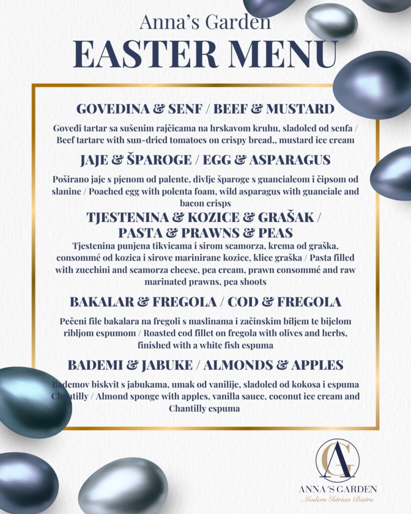To veliko noč vas Anna’s Garden vabi na posebno kulinarično doživetje – skrbno zasnovan degustacijski meni, ki združuje sezonske sestavine, ustvarjalnost in prepoznaven podpis kuhinje.